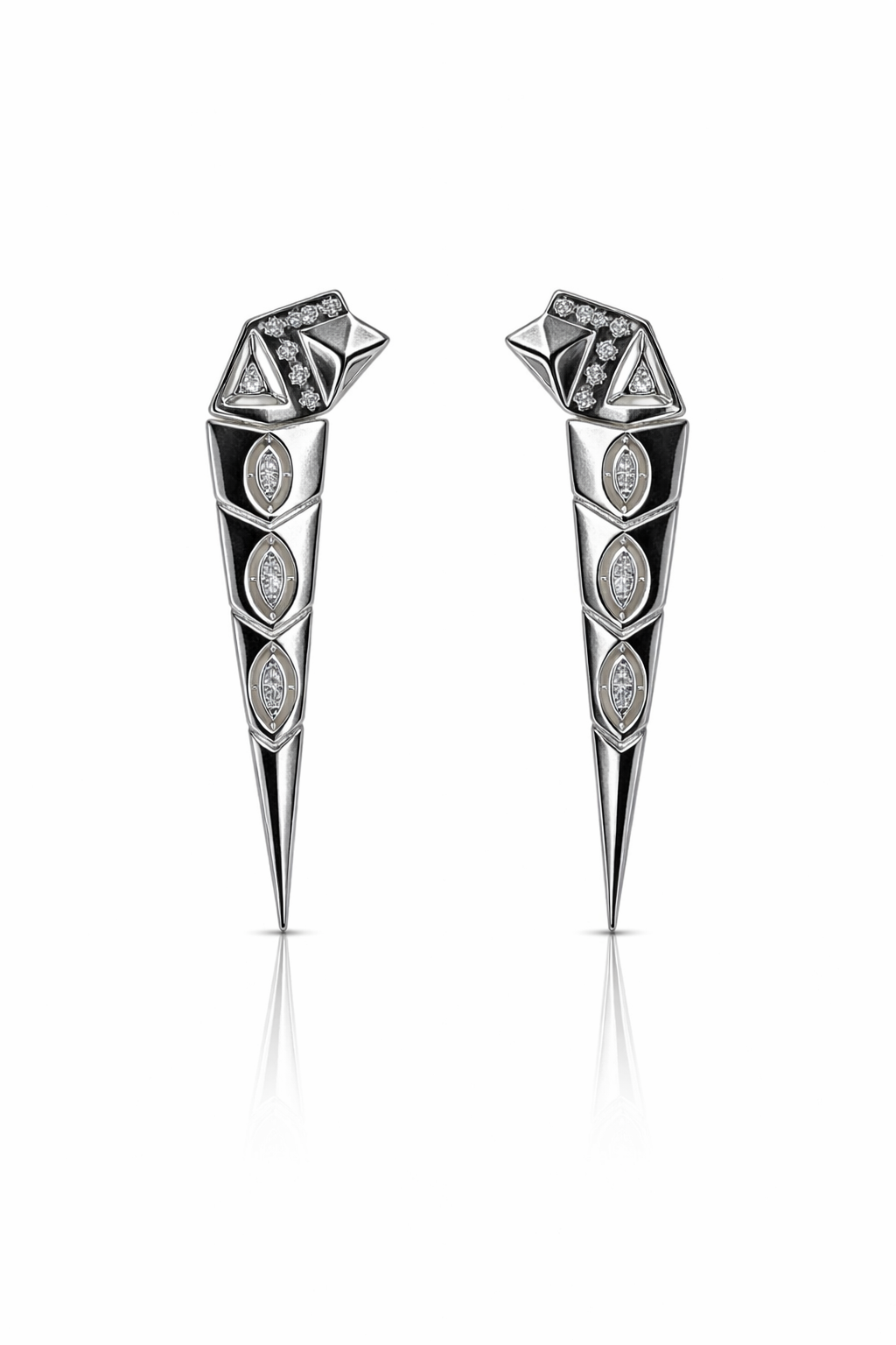 Dikkat çekici ve iddialı tasarımıyla öne çıkan Çelik Üzeri Gümüş Kaplama Zirkon Taşlı Uzun Geometrik Kadın Küpe, modern takı stilini güçlü bir form ile buluşturur. Uzun ve sivri geometrik yapısı küpeye sofistike ve karakterli bir görünüm kazandırır.