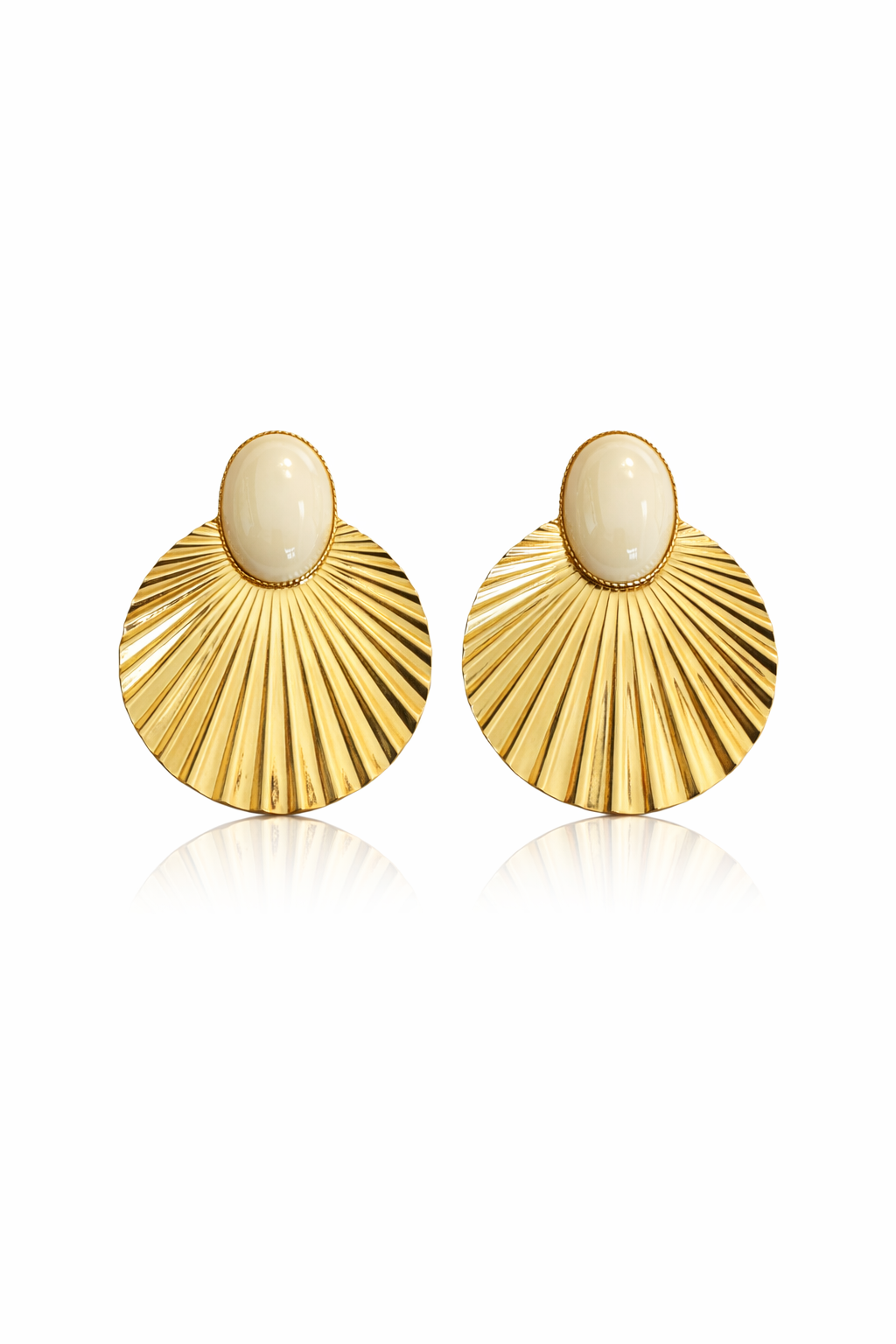 Alt bölümdeki yelpaze form ve parlak altın kaplama yüzey küpenin hareketini artırarak dikkat çekici bir etki yaratır. Günlük kombinlerde şık bir dokunuş sunarken, özel davetlerde stilinizi tamamlayan zarif bir aksesuar olur.